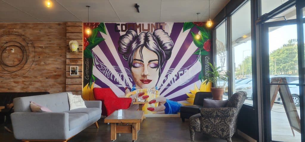 The amazing mural is located inside Brothers Coffee in Manhattan, KS! Brothers Coffee added this mural in 2022, it was designed and painted by Neal Wollenberg from Uncorked Inspiration. Which is another favorite spot in MHK!