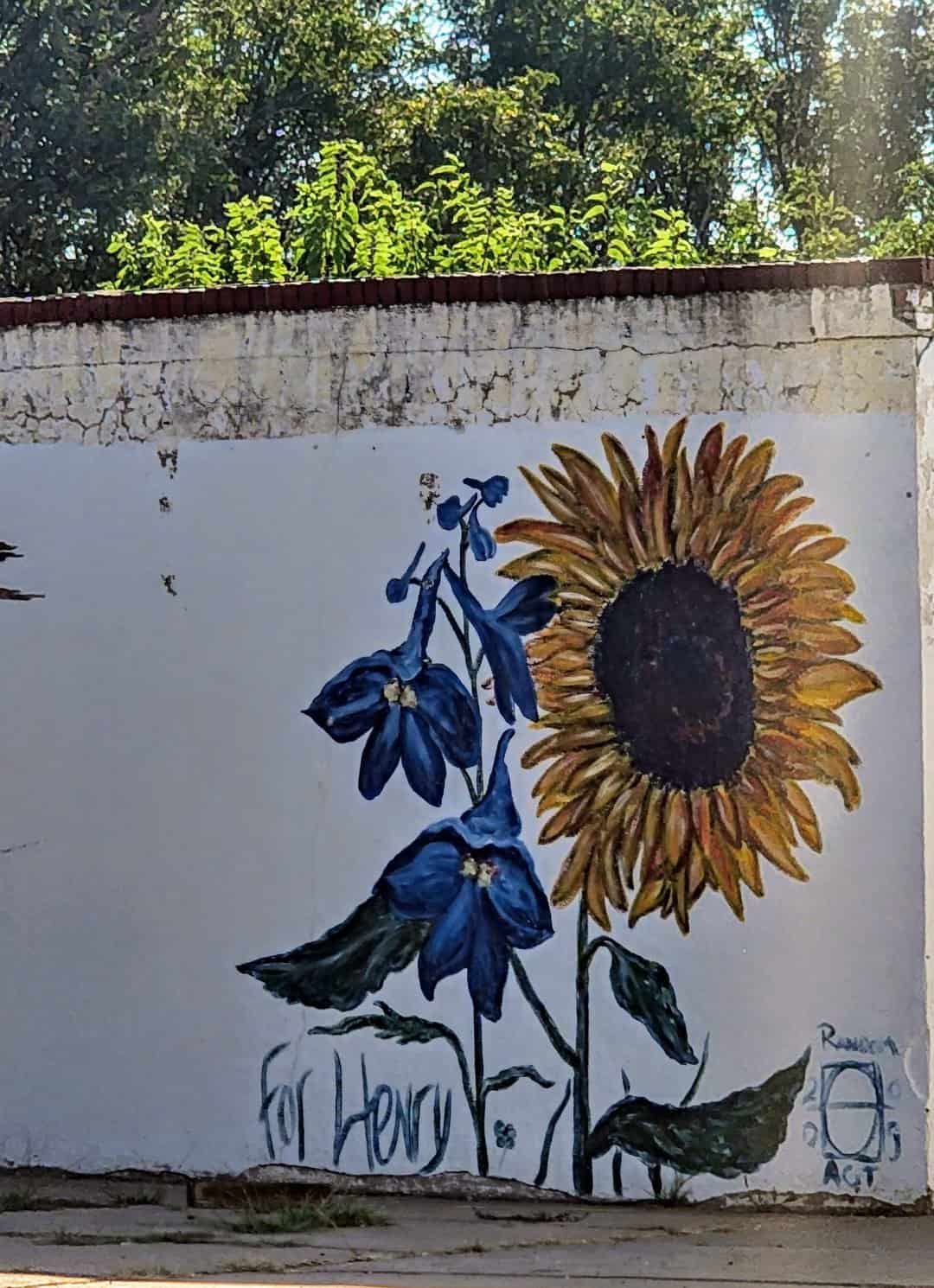 While some of these murals are not part of Brush the Bricks, I still wanted to include them, art is beautiful and tells a story. The Sunflower painted with, "for Henry," is one I found turning North on Main Street. It struck me, I could not find information about it and it made me wonder who was Henry and who painted it.