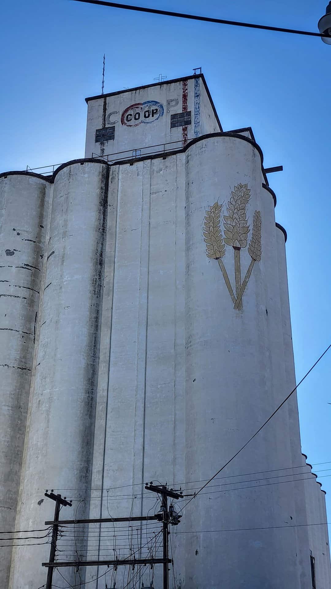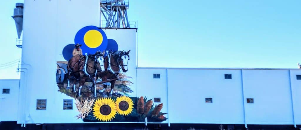The most recent mural to be added is on the Midland Marketing building at 219 E. 9th. The mural painted by local artist Dennis Schiel is of a farmer, plowing his fields with his team and accented with Sunflowers, Milo, and Wheat.