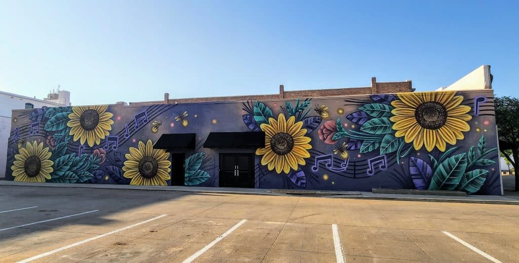 Next up is a gorgeous mural of sunflowers and musical notes painted along the side of this building in downtown Salina, KS! These sunflowers are bright yellow and pop on the purple background. It is such a fun mural!!